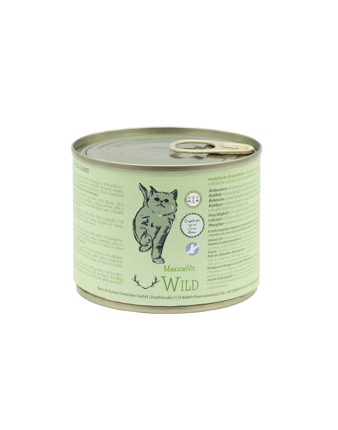 MaxicatVit Wild ist ein Alleinfuttermittel mit ausschließlich hochwertigen Zutaten, das in Deutschland hergestellt und schonend kalt abgefüllt wird. Es enthält keine Aroma- und Konservierungsstoffe und keinen Zuckerzusatz. Probieren Sie auch unsere anderen Sorten für mehr Abwechslung. Fütterungsempfehlung: Eine Dose (200g) deckt den Tagesbedarf einer Katze bis 3 kg Gewicht. Bitte füttern Sie immer zimmerwarm und passen die Futtermenge an Rasse, Alter und Aktivität an.